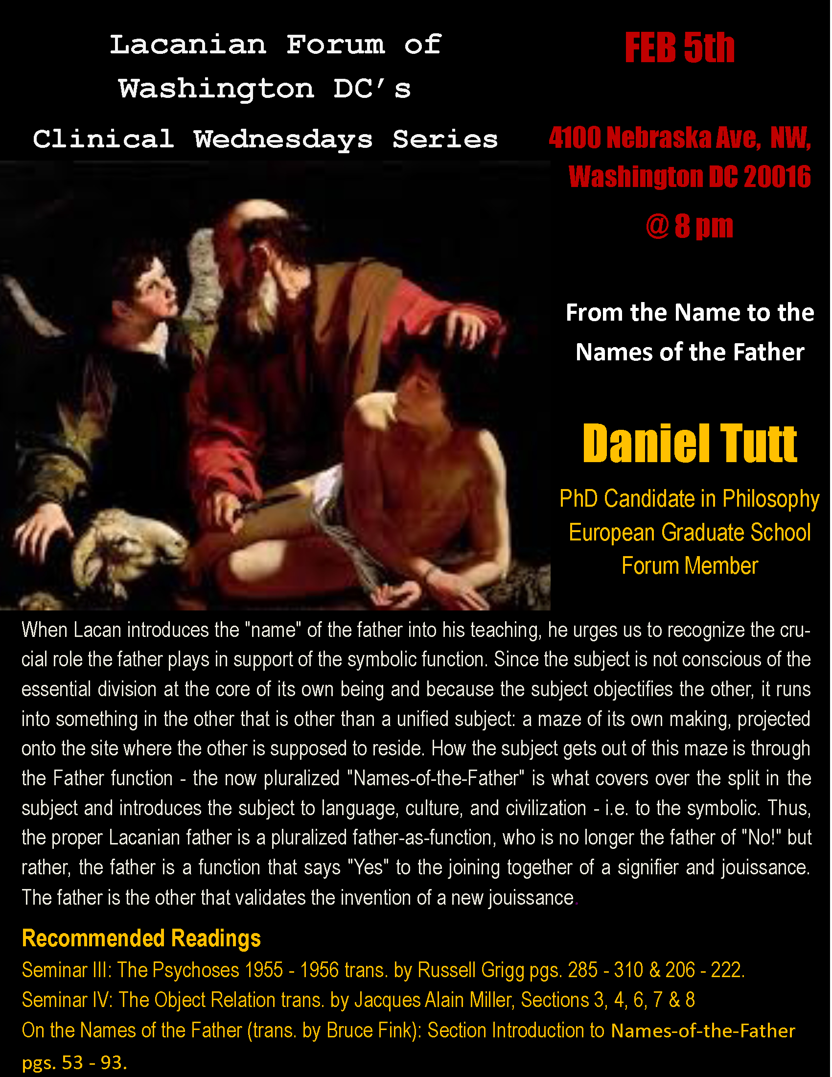 Over the past six months, I have participated as a member of the DC Lacanian Forum, an affiliate of the International of the Forums of the Lacanian Field (IF-SPFLF) based in Paris. We meet every first Wednesday of the month to present a case study or a major concept in Lacan’s work. The forum is made up of Lacanian-influenced analysts, students, and people in training to become analysts. While I am not an analyst, and come at Lacan from the perspective of philosophy and theory, I have been warmly received by this group.