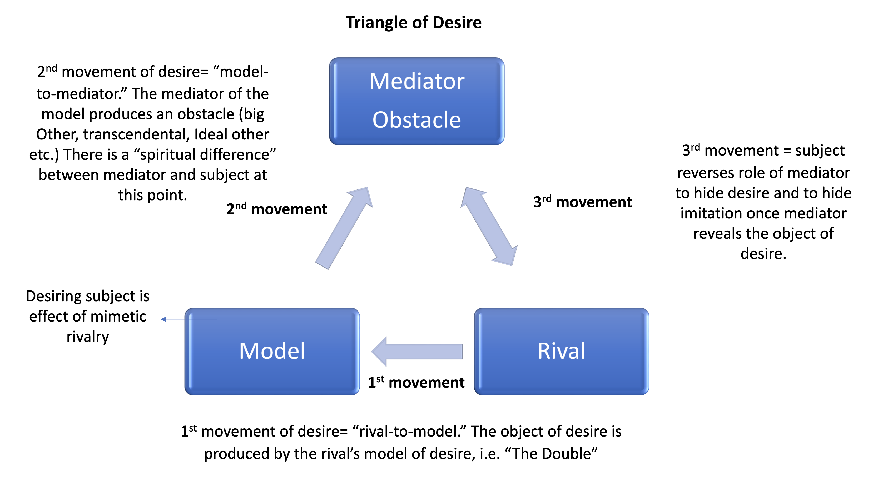 In Girard’s Deceit, Desire and the Novel he introduces the concept of the ‘triangle of desire” which I have diagrammed to demonstrate the core movements involved with the theory of mimetic desire.