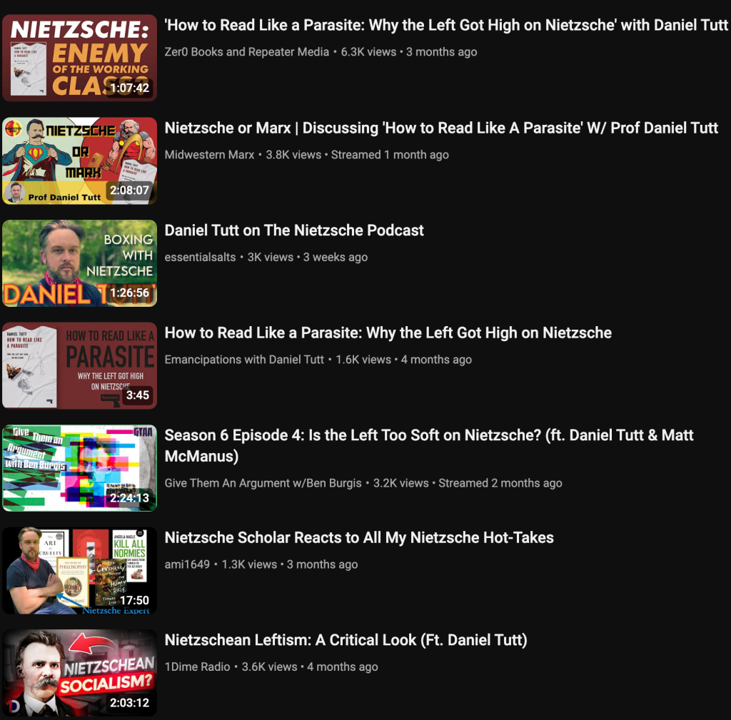 Since its release in early January, my book How to Read Like a Parasite has managed to start conversations on various podcasts, from The Nietzsche Podcast, Repeater Books, Give Them An Argument with Ben Burgis, Midwestern Marx with Carlos Garrido, 1Dime Radio, Converging Dialogues, Samsara Diagnostics, the New Books Network to the Re/al/ign show with Rhyd Wildermuth along with others. The French Marxist philosopher Aymeric Monville has recently mentioned and discussed my book in a recent talk entitled Misère du Nietzschéisme de gauche. Each conversation is enjoyable in its own way because the host has in nearly every case read my book carefully and they thus bring out singular concerns from their perspective. Check out all the interviews on my playlist New Directions in Nietzschean Studies.