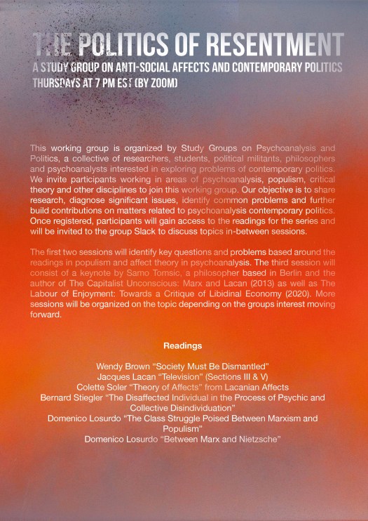 I’m happy to announce that we have an upcoming keynote lecture by Samo Tomsic on “The Politics of Resentment” on December 3rd at 7 pm. You can register for this talk here and check out our prior two sessions here (on ressentiment, sublimation and neoliberalism) and here (on Lacan, affects, and the four five discourses). This is hosted by Study Groups in Psychoanalysis and Politics, a new working group I have helped to establish in the pandemic time. The cost to attend is totally sliding scale – so whatever you are able to contribute is fine.